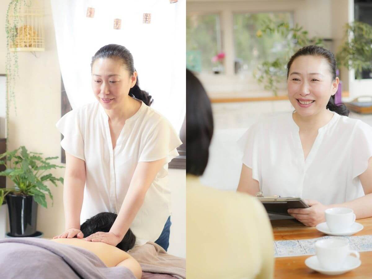 清潔感があり、通ってみたいと思わせる温かみのあるサロン風景。この人なら安心して施術を任せられるというお人柄。『気持ちよさそう!』『うけてみたい!』と思わせる施術の様子。